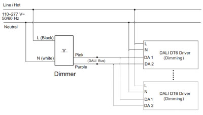 Hinweis 2: Der Dimmer und der DALI-Treiber/Decoder sind unabhängig voneinander an die Eingangsleistung (Wechselstromnetz) angeschlossen.