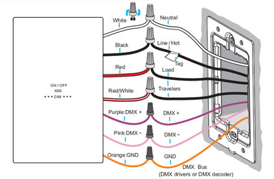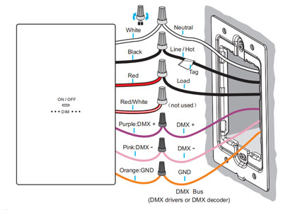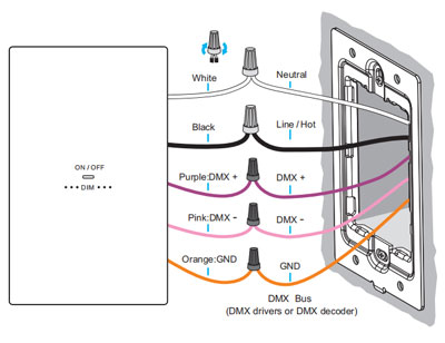 Das Ein-Tasten-DMX-Dimmer Mit einem Eingangsspannungsbereich von 100–277 V AC ist das Gerät wandmontiert und benötigt keine Adressierung oder Parameterkonfiguration. Es verfügt über DMX-Ein- und -Ausgang. Es ist für die Standard-Inneneinrichtung konzipiert und für die Innenbeleuchtung geeignet.