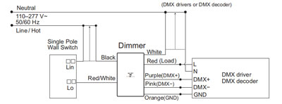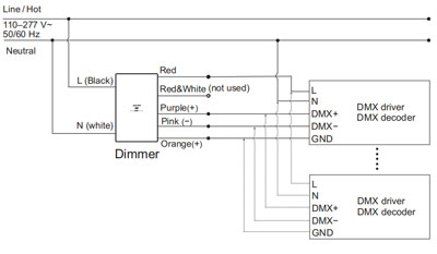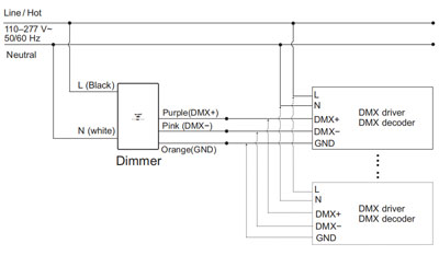 Hinweis 2: Der Dimmer und der DMX-Treiber/Decoder sind unabhängig voneinander an die Eingangsleistung (Wechselstromnetz) angeschlossen.