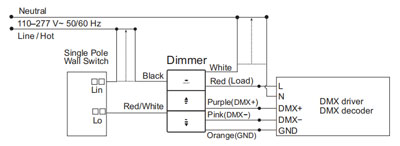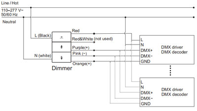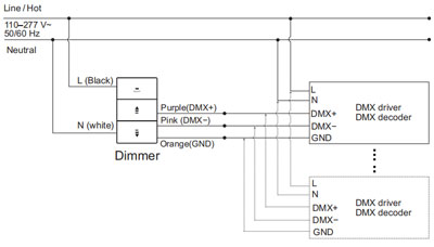 Hinweis 2: Der Dimmer und der DMX-Treiber/Decoder sind unabhängig voneinander an die Eingangsleistung (Wechselstromnetz) angeschlossen.