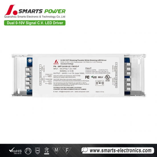 Die Smartpower 0-10V Dual-Signal dimmbares 100W LED-Netzteil Es verfügt über eine integrierte aktive PFC-Funktion, einen Konstantspannungsbetrieb und einen Wirkungsgrad von bis zu 90 %. Der Dimmbereich von 0 bis 100 % ist stufenlos und stabil ohne Flimmern.