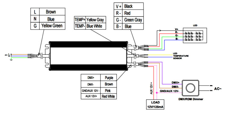 2. Der Modellname SMT - CA xx 6300 -DMX A -Y bedeutet, dass eine Hilfsstromversorgung vorhanden ist, aber keine Lampentemperaturerkennung, sodass der LED-Treiber keine Verkabelung zur Lampentemperaturerkennung hat.